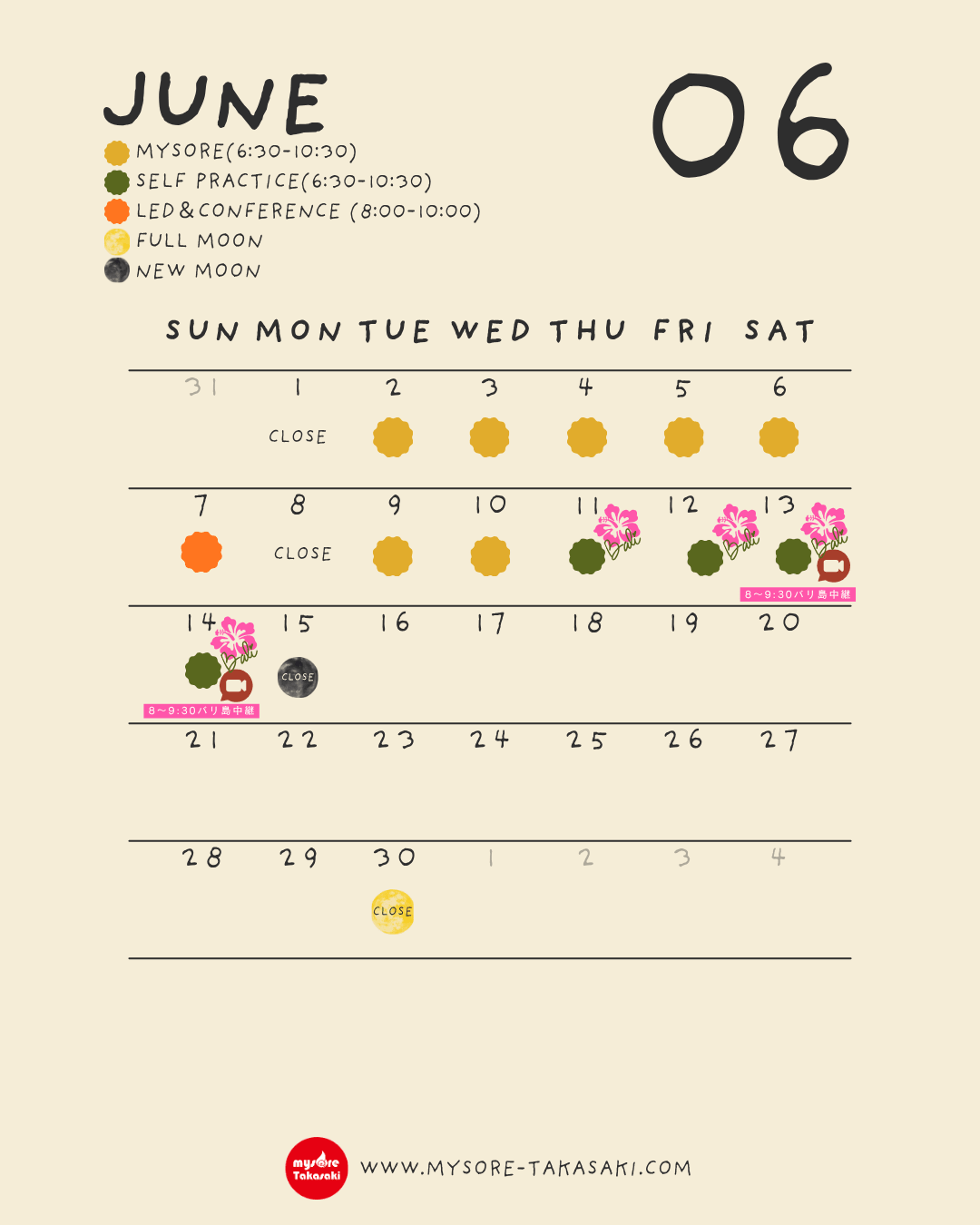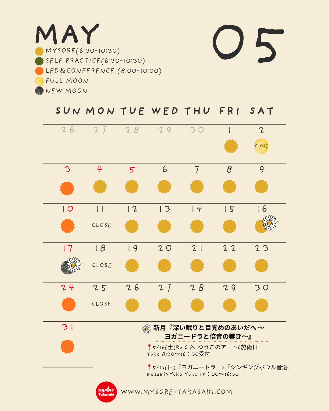 +満月と新月の日は、クラスはお休みです。+簡単なお着替えスペースがございます。動きやすい服装、タオル、ヨガマットをお持ちください。