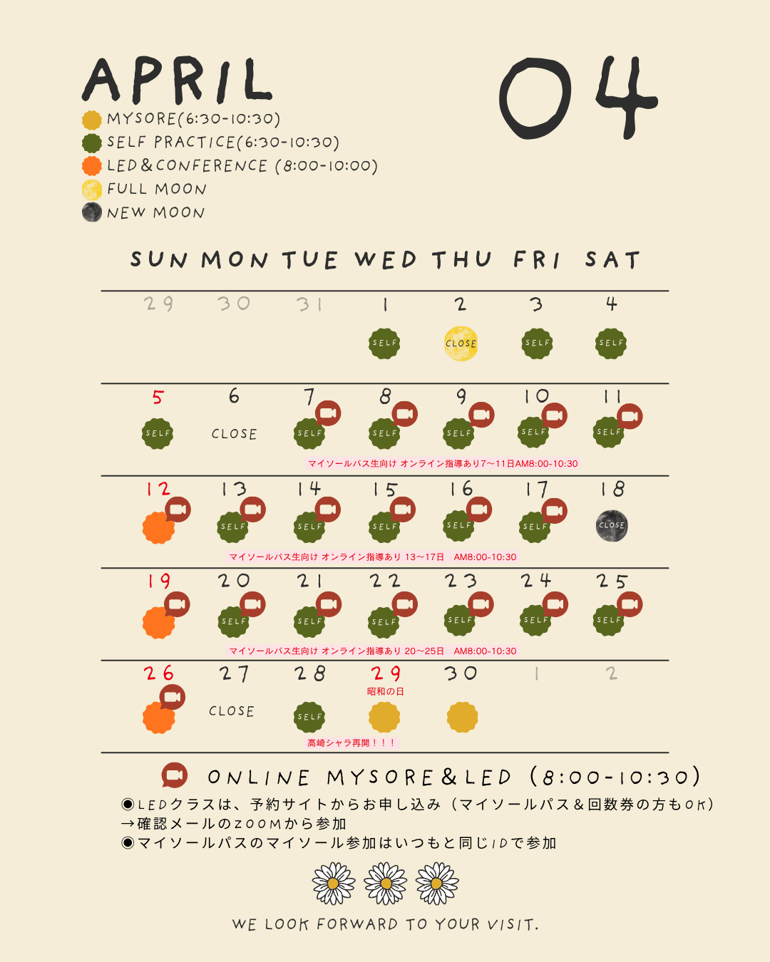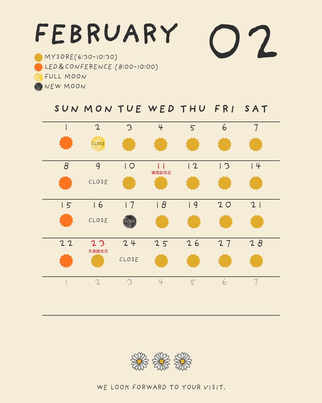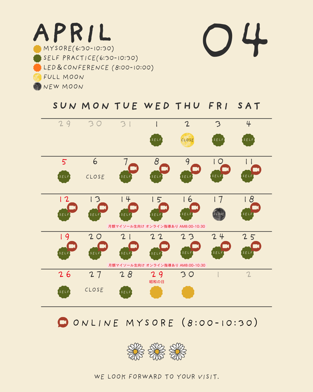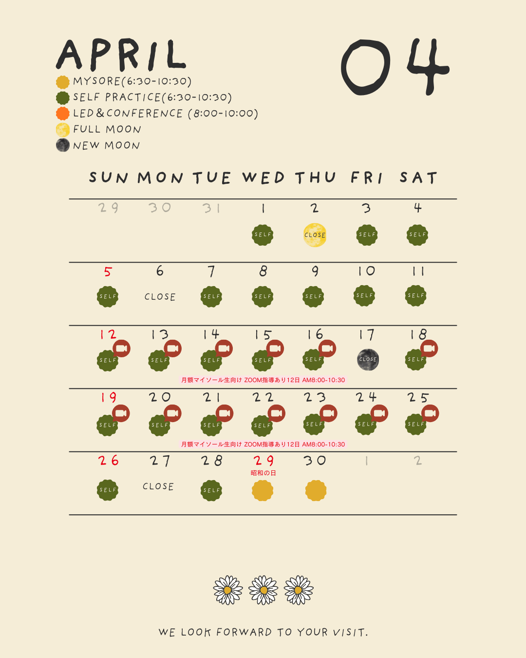 +満月と新月の日は、クラスはお休みです。+簡単なお着替えスペースがございます。動きやすい服装、タオル、ヨガマットをお持ちください。